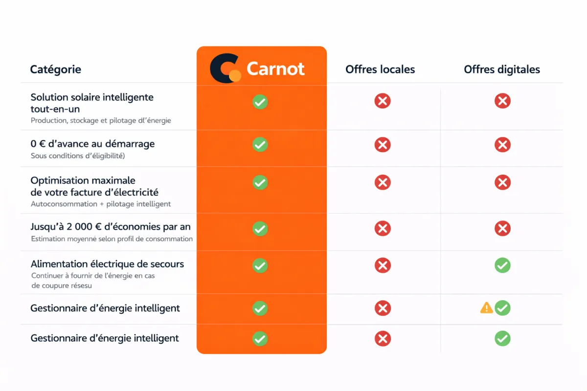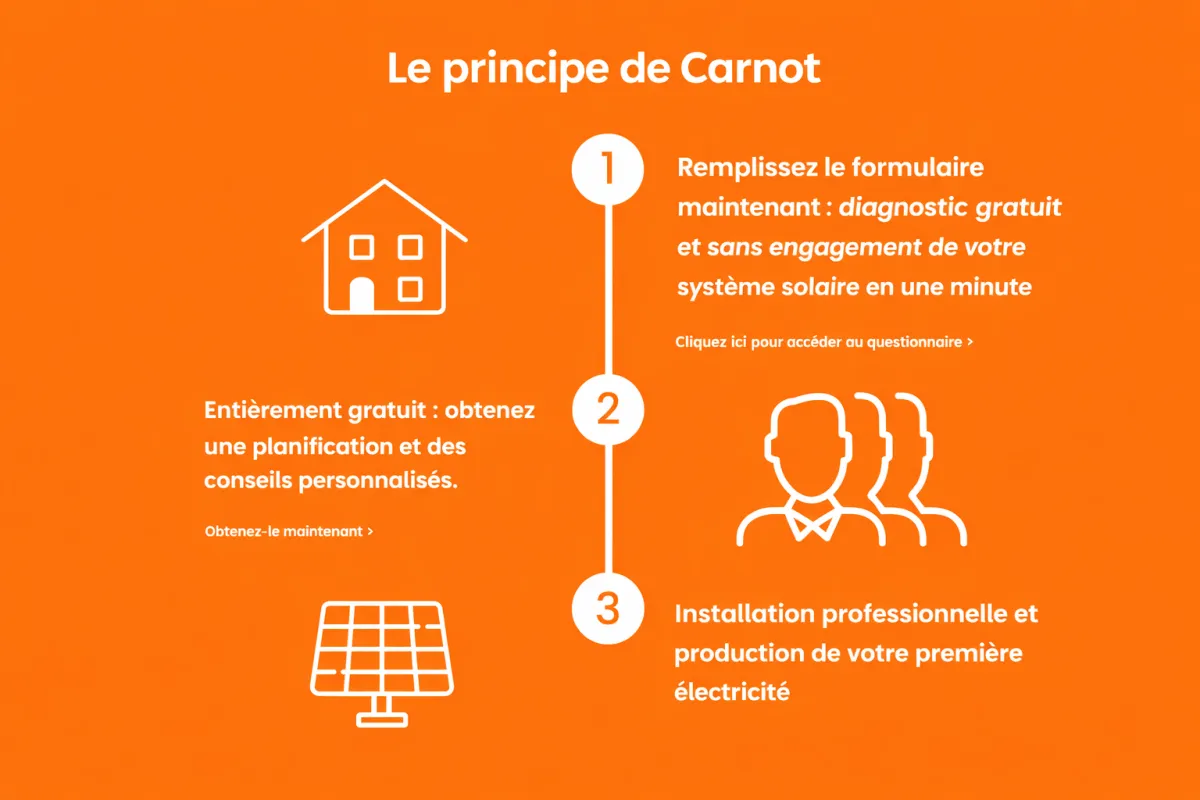 Le tarif de rachat de Carnot offre des revenus nettement supérieurs à celui du gouvernement. Ce dernier est inférieur à 8 centimes/kWh et est par ailleurs limité par une limitation de puissance active (en l'absence de compteur intelligent). Carnot, en revanche, permet la commercialisation automatisée et sans limitation de l'électricité à des prix élevés. Vous pouvez ainsi gagner jusqu'à 2 000 € par an grâce à la vente directe avec Carnot, contre seulement quelques centaines d'euros en général avec le tarif gouvernemental.